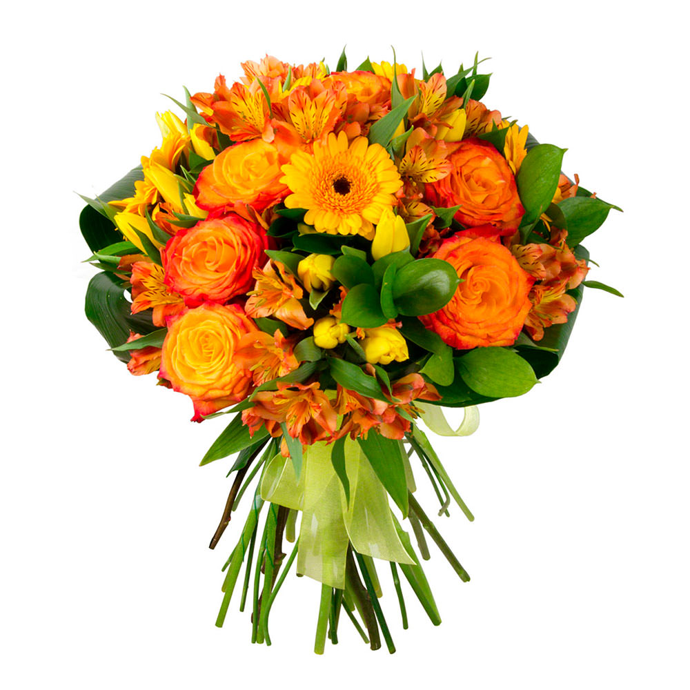 Роза одноголовая рыжая, гербера, альстромерия, зелень.